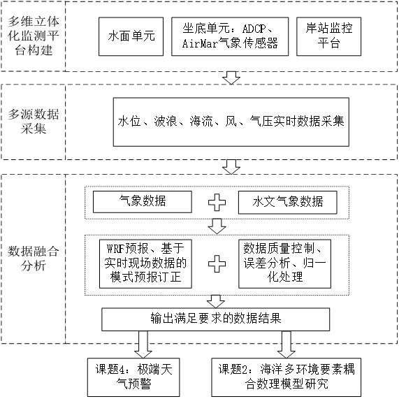 海上风电智能检测系统在现有海上风电场已有监测手段的基础上,引入海洋环境监测设备、坐底式潜标平台、卫星通讯等技术,完成风电场区域广域海洋环境全景感知体系建设,并探索适用于风电场应用实践的数据融合方法,使之具备多时间尺度和空间分辨率的天气预报能力。下图为总体设计图。